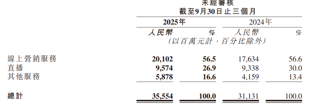 直播业务是快手的传统核心业务,前三季度收入294.32亿元,同比增长8.1%;第三季度单季收入95.74亿元,同比增长2.5%,环比2025年第二季度的100.44亿元下滑4.7%,业务基本盘呈现疲软态势。