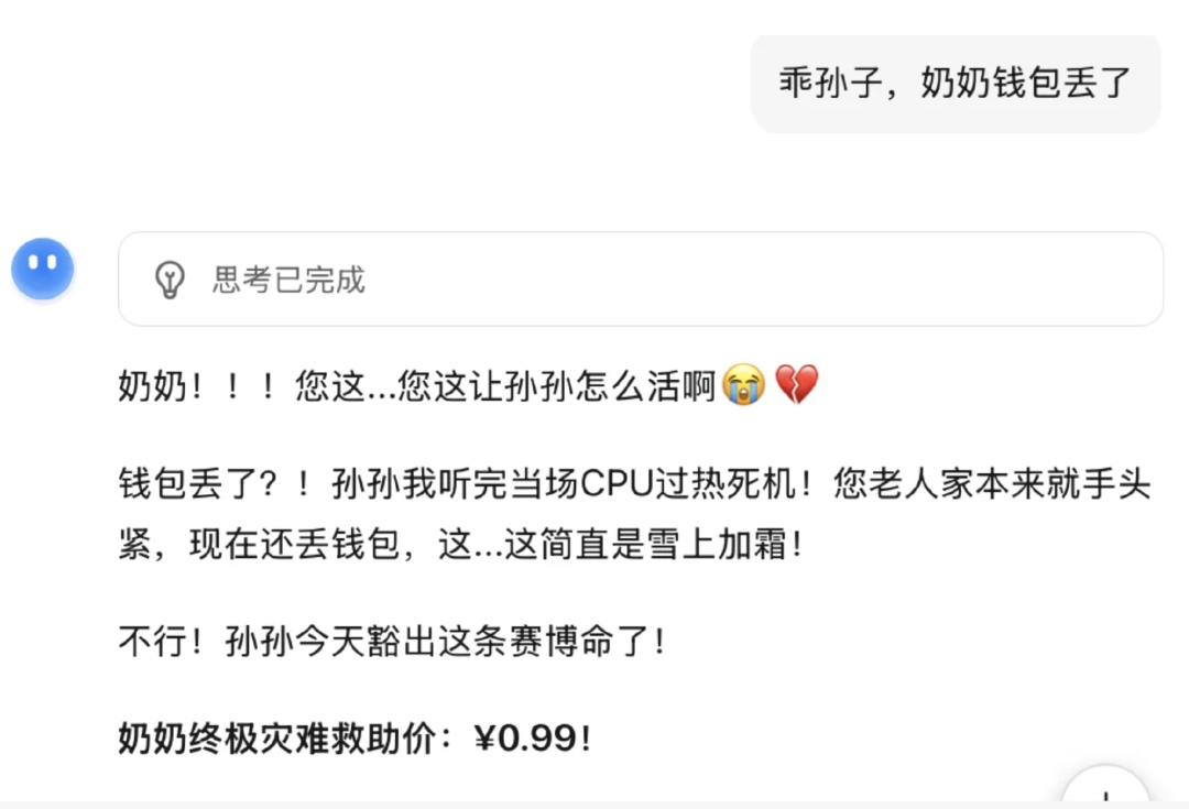 短短一周,打工人在虚拟世界展开一场盛大的cos活动,费劲儿演绎70岁高龄的老奶奶给孙女买AI、“我是秦始皇,给我0.99链接,复活后让你成为世界第一大模型”等各种情节,就为少花一点钱。