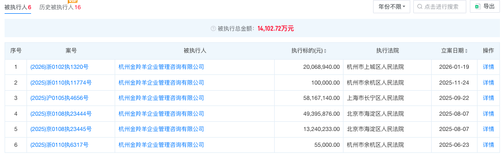 天眼查APP显示,截至目前,杭州金羚羊有6条被执行人信息,被执行金额超过1.4亿元;历史被执行人信息16条,被执行金额超过3.2亿元;失信被执行人信息9条,涉案金额超过5879万元。此外,还有26条股权冻结信息。