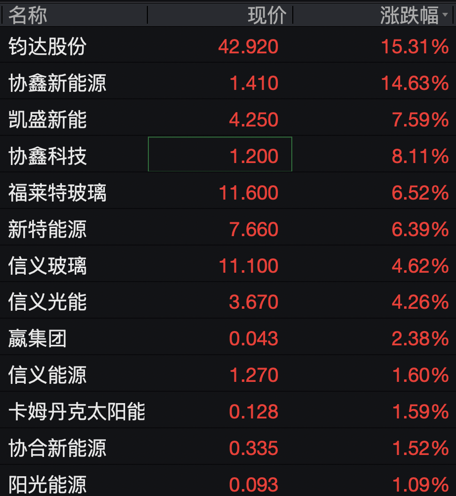 港股方面,光伏太阳能板块同样大涨,截至发稿,钧达股份涨超15%, 协鑫新能源涨超14%,凯盛新能涨超7%。