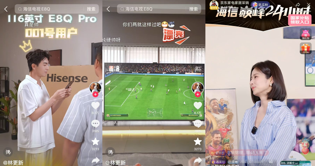 在内容上,联动林更新、颖儿,以明星流量撬动体育、科技圈层关注,林更新VLOG以“踢球避暑”为创意原点,通过趣味化场景展示海信116英寸E8Q Pro大屏互动功能,颖儿探家VLOG则以女明星日常生活为切口自然植入海信产品,成功将品牌科技感与明星真实生活绑定,激发用户对智能家居场景的向往。