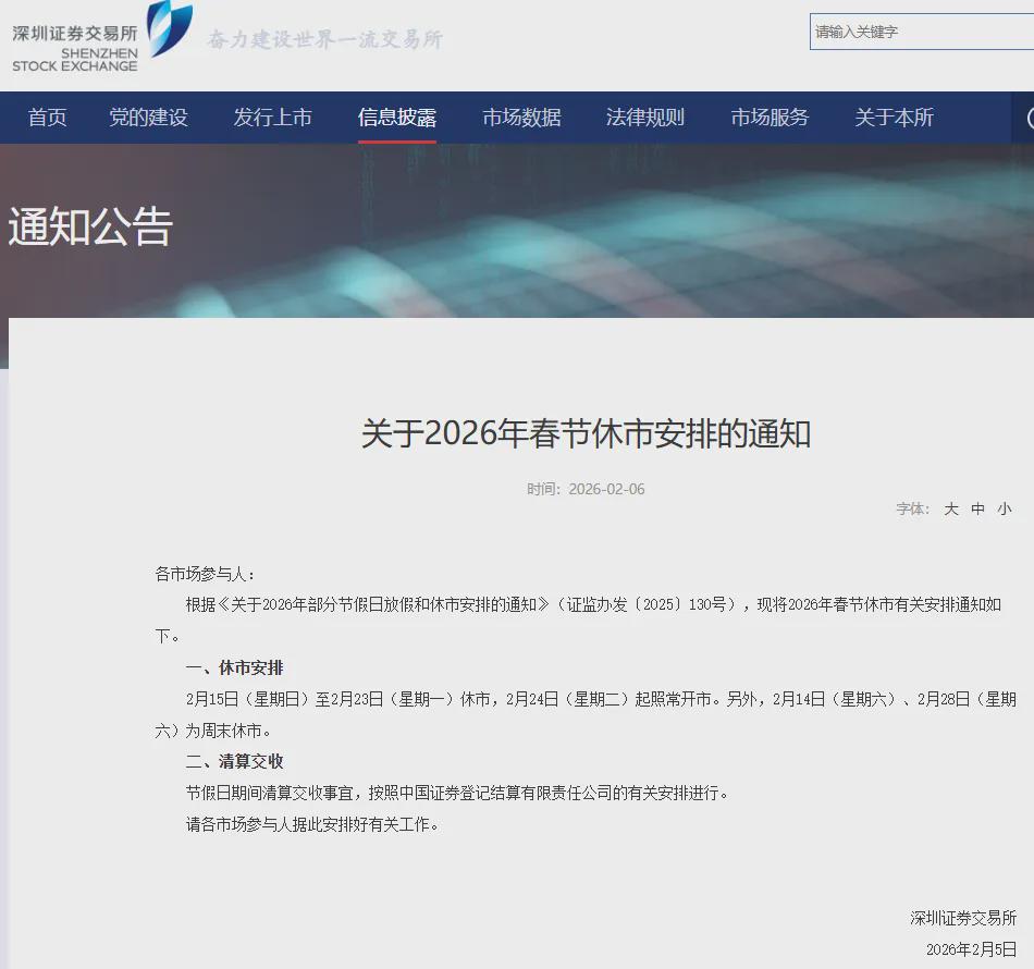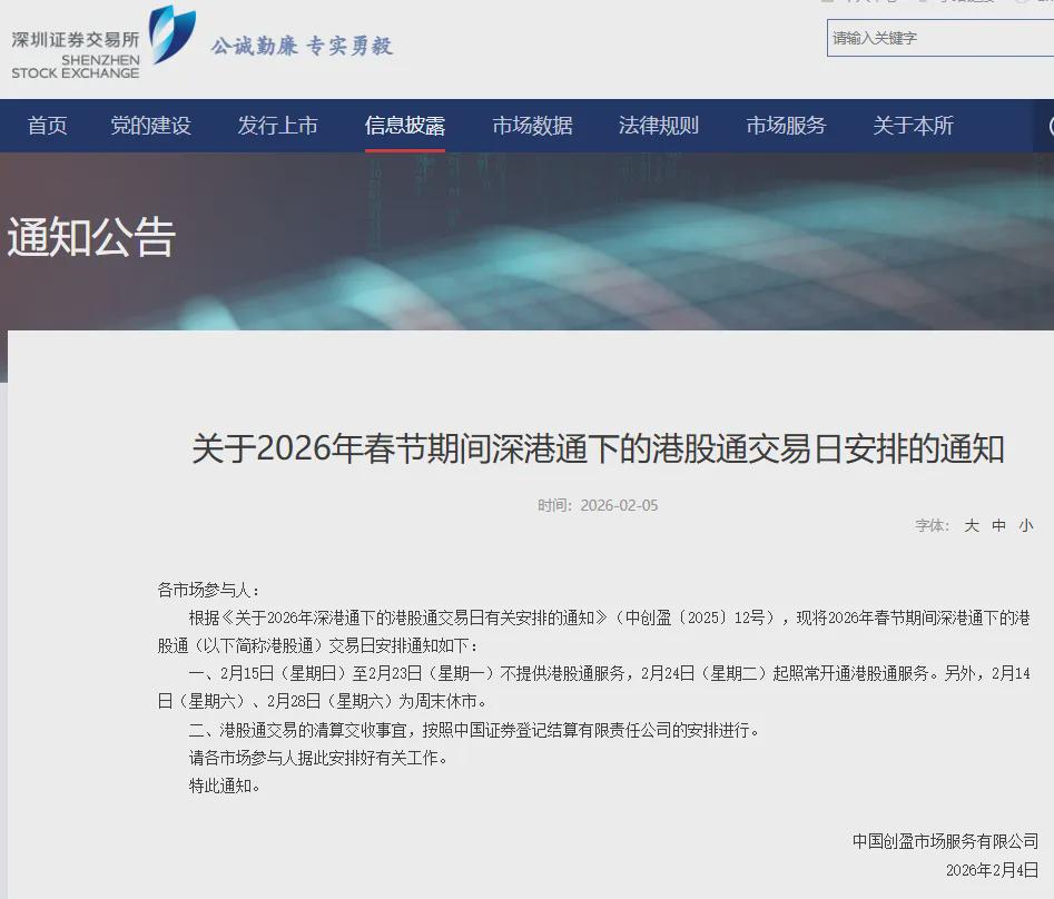 近日,深交所发布“关于2026年春节休市安排的通知”及“关于2026年春节期间深港通下的港股通交易日安排的通知”: