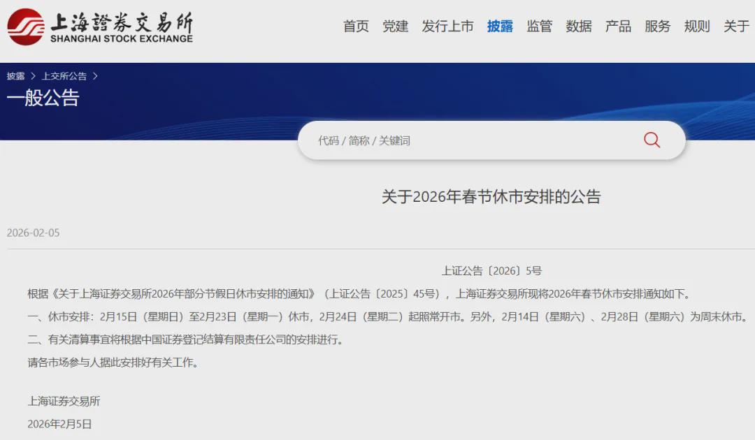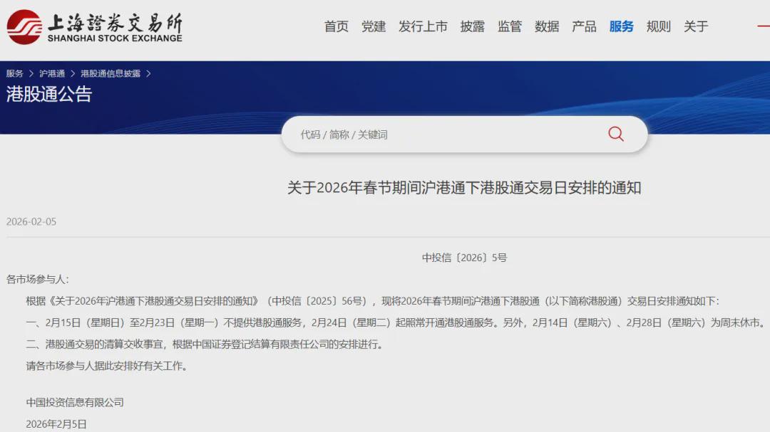 2月5日,上交所发布“关于2026年春节休市安排的公告”及“关于2026年春节期间沪港通下港股通交易日安排的通知”: