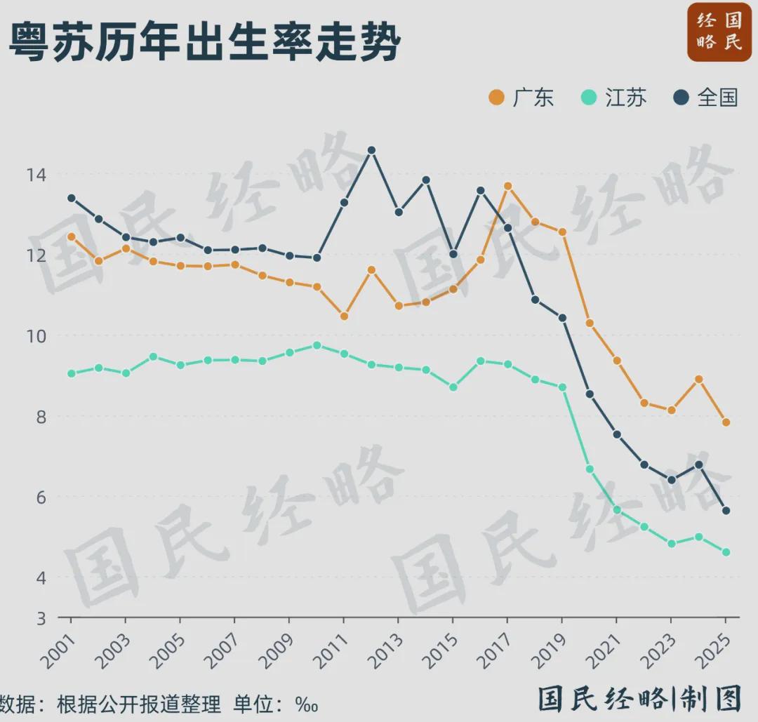2025年,广东人口出生率为7.52‰,超过全国2.19个千分点;死亡率只有5.56‰,比全国低2.48个千分点。