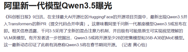 据报道,在全球最大AI开源社区HuggingFace的开源项目页面中,最新出现Qwen3.5并入Transformers的新PR(提交代码合并申请)。