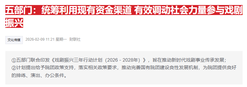 中共中央宣传部、教育部、财政部、文化和旅游部、中国文联等5部门近日联合印发《戏剧振兴三年行动计划(2026-2028年)》。