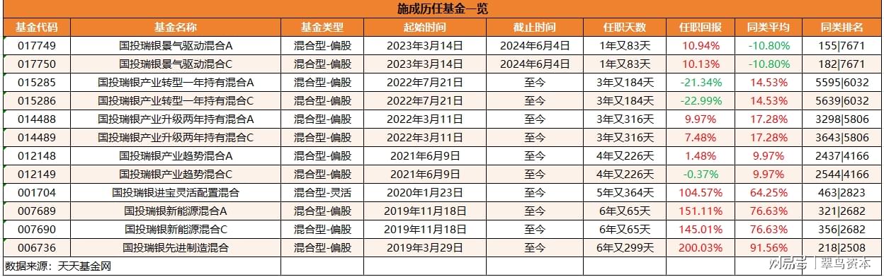 施成在国投瑞银历任基金产品一览 数据来源:天天基金网