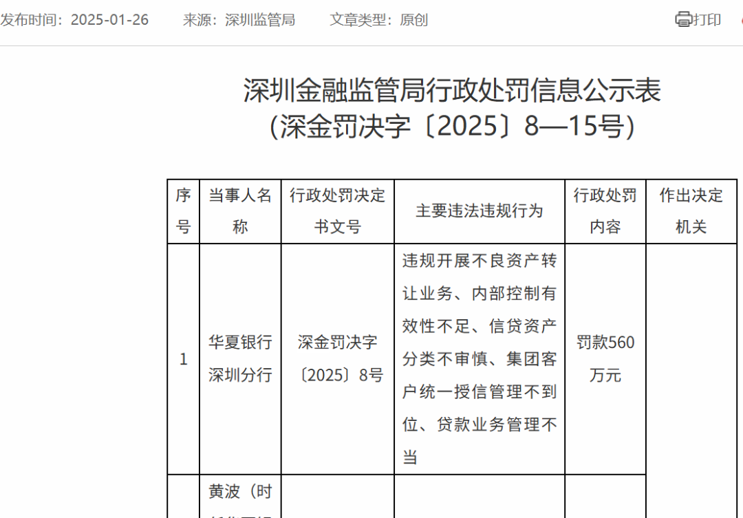 2025年1月底,深圳金融监管局公布的一则行政处罚信息显示,华夏银行深圳分行因“违规开展不良资产转让业务、内部控制有效性不足、信贷资产分类不审慎、集团客户统一授信管理不到位、贷款业务管理不当”等多项问题,被处以560万元罚款。