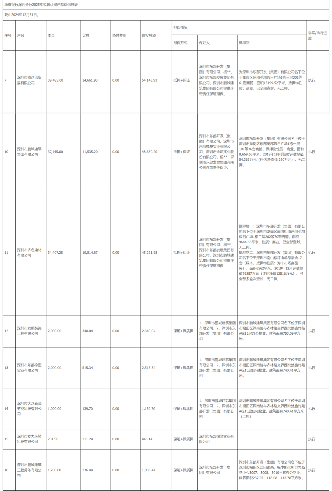 2025年2月的拟转让公告显示,腾达迅、鹏城建筑、齐名建材三家公司在华夏银行深圳分行的贷款本金余额合计约11.10亿元。