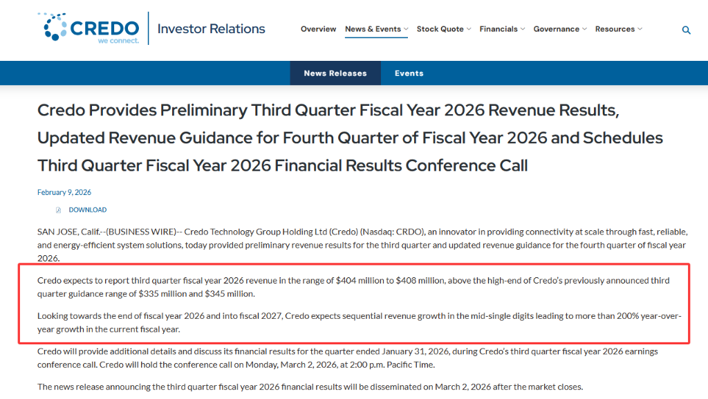 2月9日周一,Credo在美股盘后发布了2026财年第三季度(截至2026年1月31日)的初步财务业绩,并更新了全年展望。