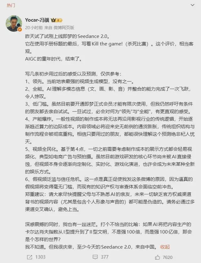 再看《黑神话:悟空》的制作人冯骥,说话更直接:“AIGC的童年时代,这下是真结束了!”他用五个词总结体验,说Seedance2.0是“领先、全能、低门槛、产能爆炸、视频全民化”,还补了句:“这就是当前地表最强的视频生成模型,没有之一。”