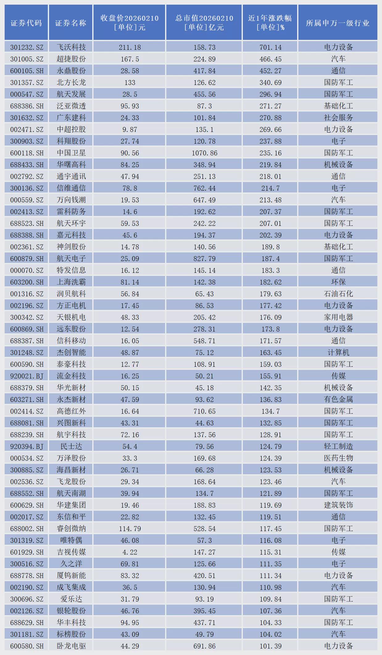 从二级市场表现看,近一年来,475家上市公司中,股价实现上涨的有389家。其中,52家涨幅超过100%。飞沃科技(301232.SZ)、超捷股份(301005.SZ)、永鼎股份(600105.SH)、北方长龙(301357.SZ)、航天发展(000547.SZ)、泛亚微透(688386.SH)、广东建科(301632.SZ)、中超控股(002471.SZ)、科翔股份(300903.SZ)、中国卫星(600118.SH)、华曙高科(688433.SH)、通宇通讯(002792.SZ)、信维通信(300136.SZ)、万向钱潮(000559.SZ)、雷科防务(002413.SZ)、航天环宇(688523.SH)、嘉元科技(688388.SH)等17家公司近一年股价涨幅超过200。