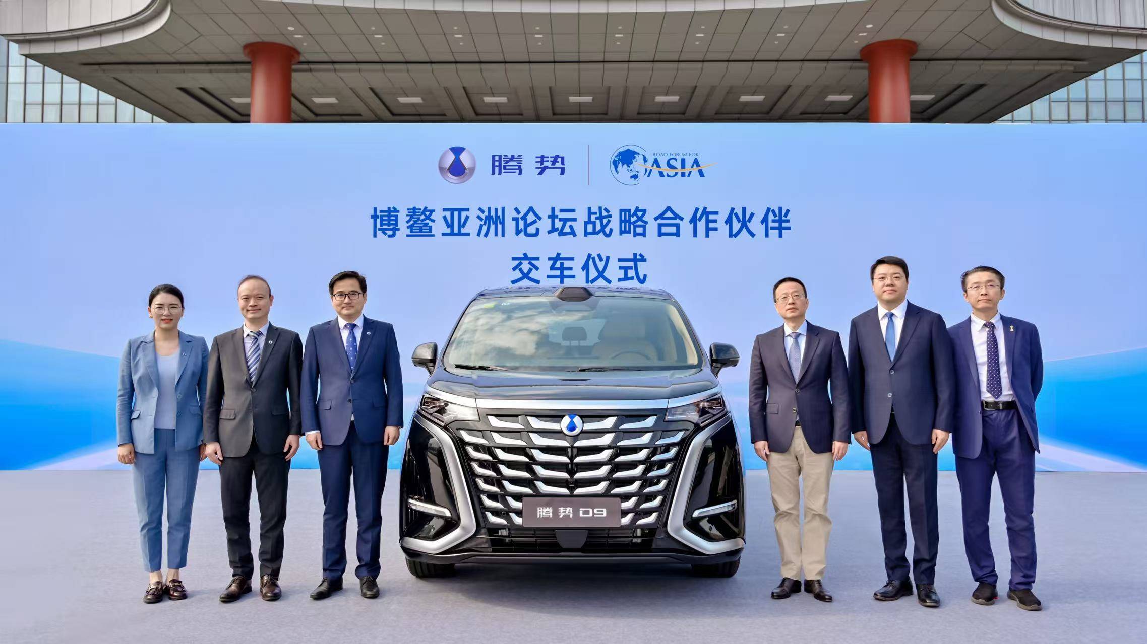 腾势汽车总经理李慧(左)向博鳌亚洲论坛交付腾势D9