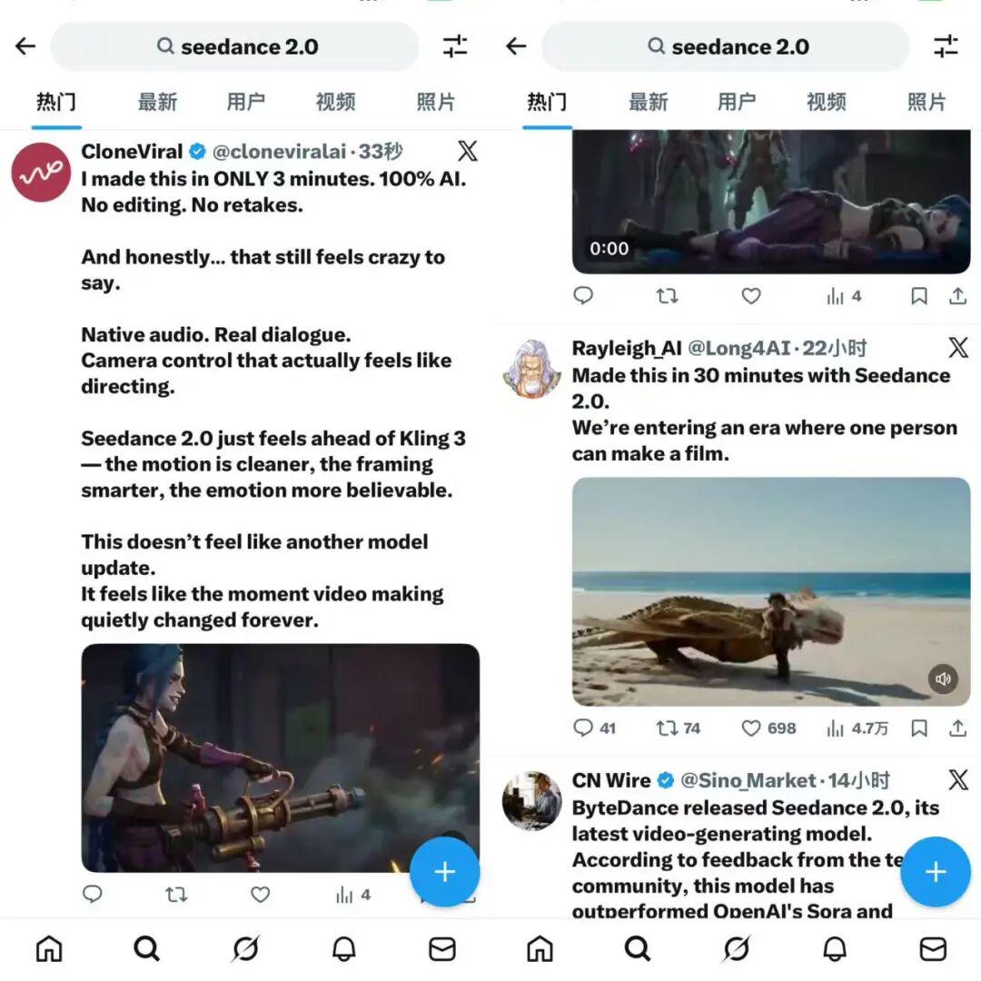 短短几天内,Seedance 2.0 的测评内容几乎刷屏,社交平台和技术社区充斥着对其能力的讨论。游戏科学 CEO 冯骥甚至直言,这是“当前地表最强的视频生成模型,没有之一”。在海外平台,相关演示视频同样引发热议,不少网友用“insane”来形容其效果。