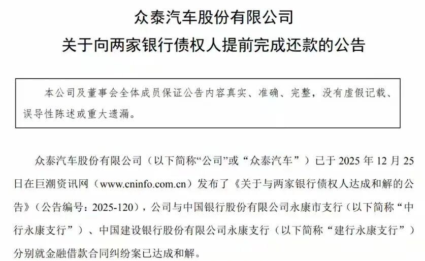 能不能不知道,但还钱至少是诚恳的,1月26日,众泰发布公告宣布,已提前5天全额偿还中行永康支行剩余债务212,014,262.93元、建行永康支行剩余债务172,833,512.50元,合计约3.85亿元,顺利履行完毕与两家银行此前达成的调解约定。
