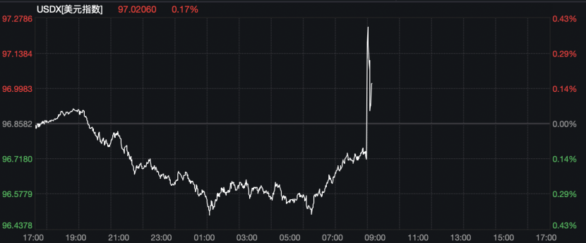 美元指数直线拉升,迅速由跌转涨,一度涨0.43%,随后涨幅有所收窄;美国国债收益率上涨,2年期国债收益率报3.535%,10年期国债收益率升至4.2%,30年期国债收益率升至4.83%。