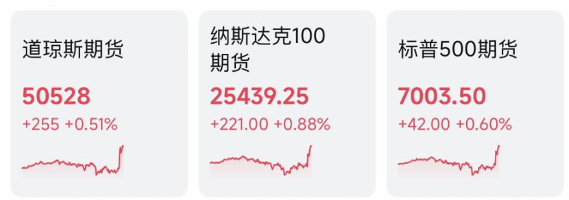 数据公布后,美股期指集体拉升,截至北京时间22:00,道琼斯指数期货涨0.51%,标普500指数期货涨0.6%,纳斯达克100指数期货涨0.88%,罗素2000指数期货上涨0.84%。