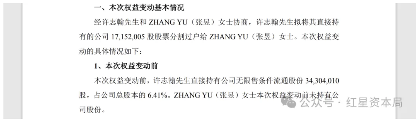 许志翰拟将其直接持有的1715.2万股股票分割过户给张昱。本次权益变动前,许志翰直接持有公司无限售条件流通股份3430.40万股股票,占公司总股本的6.41%,张昱女士本次权益变动前未持有公司股份。