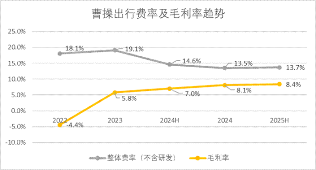 过去三年间,曹操出行的费率(销售+管理)从18.1%下降稳定至13.5%区间,整体的毛利率从7%增长至8.4%。