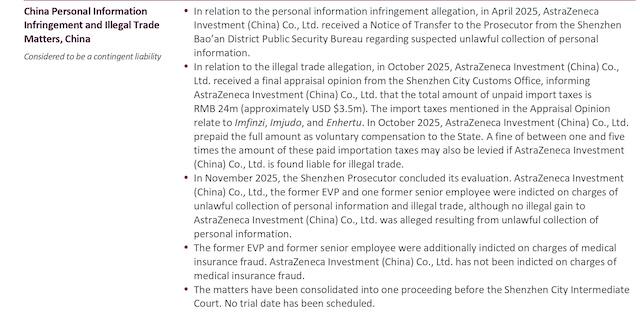 阿斯利康在近日发布年报中曾提及称,2025年11月,深圳检方完成审查,并对阿斯利康中国、阿斯利康一名前执行副总裁和一名前高级员工以涉嫌非法收集个人信息及非法贸易罪名提起公诉。该名前执行副总裁和该名前高级员工还被追加医保诈骗罪名。