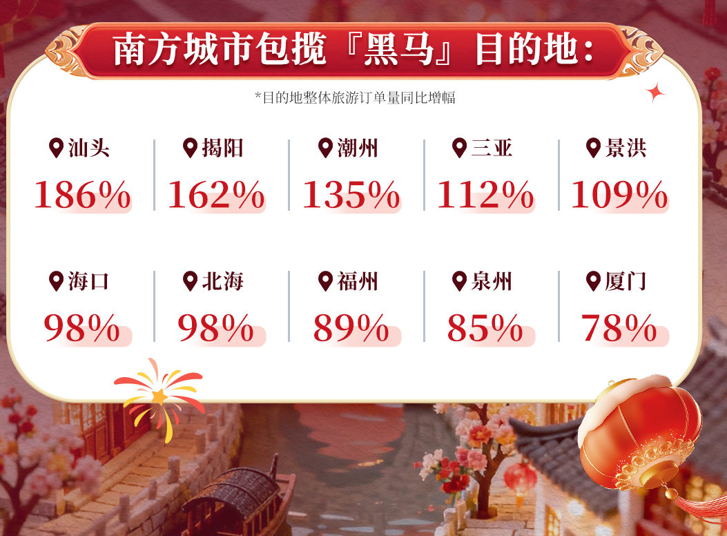 携程发布的《2026马年春节旅游市场预测》显示,在国内黑马目的地榜单上,汕头以186%的预订单同比增幅领跑,揭阳(162%)、潮州(135%)紧随其后,福州和泉州等闽南城市预订单涨幅也在80%至90%。