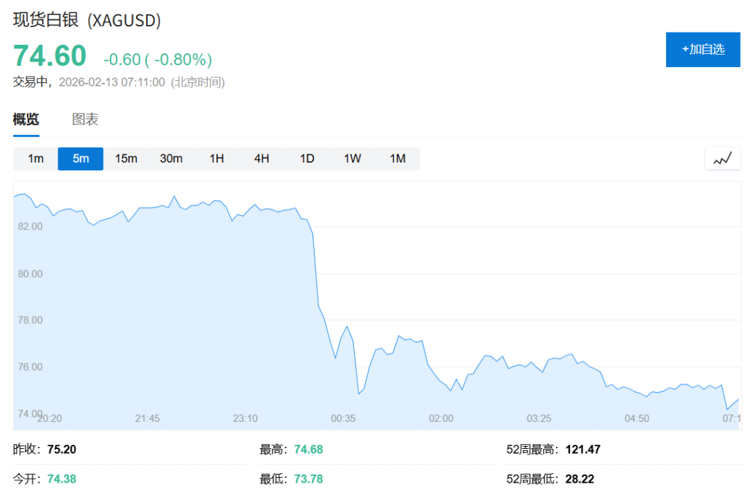 周四(2月12日)纽约尾盘,现货白银跌10.89%,报75.0942美元/盎司。北京时间00:00之前持稳于82美元上方,维持微幅下跌状态,随后大幅跳水,快速跌穿76美元,并在临近美股收盘时刷新日低至74.4456美元。