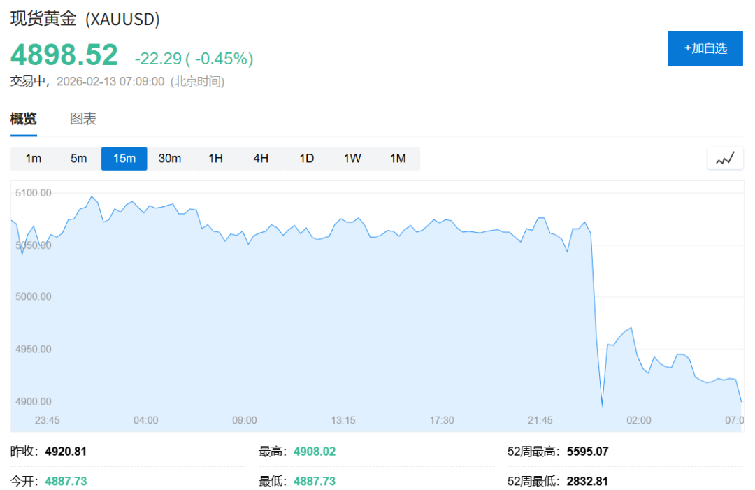 周四纽约尾盘,现货黄金跌3.26%,报4918.36美元/盎司。北京时间00:00之前维持微幅下跌状态,主要持稳于5050美元上方,随后出现一波急剧的跳水行情,刷新日低至4878.66美元。