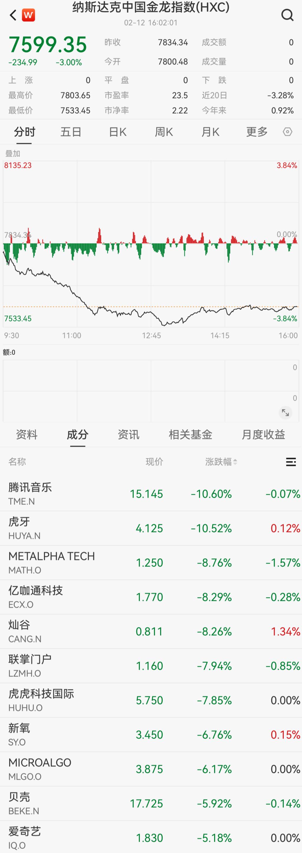 热门中概股集体下跌,纳斯达克中国金龙指数跌3%。个股方面,腾讯音乐大跌超10%,贝壳跌近6%,爱奇艺跌超5%,哔哩哔哩跌近5%,百度集团跌超4%,世纪互联涨超3%,金山云涨逾2%,亚朵涨超1%。