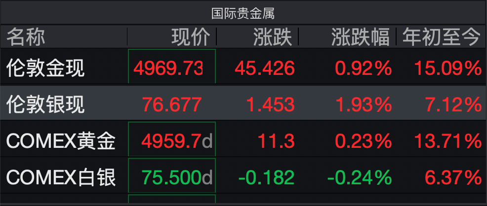 截至2月13日发稿时,金银价格集体回暖,伦敦金现货价格涨0.92%,报4969.73美元/盎司;伦敦银现货价格涨1.93%,报76.677美元/盎司;COMEX黄金期货价格涨0.23%,报4959.7美元/盎司;COMEX白银期货价格下跌0.24%,报75.5美元/盎司。