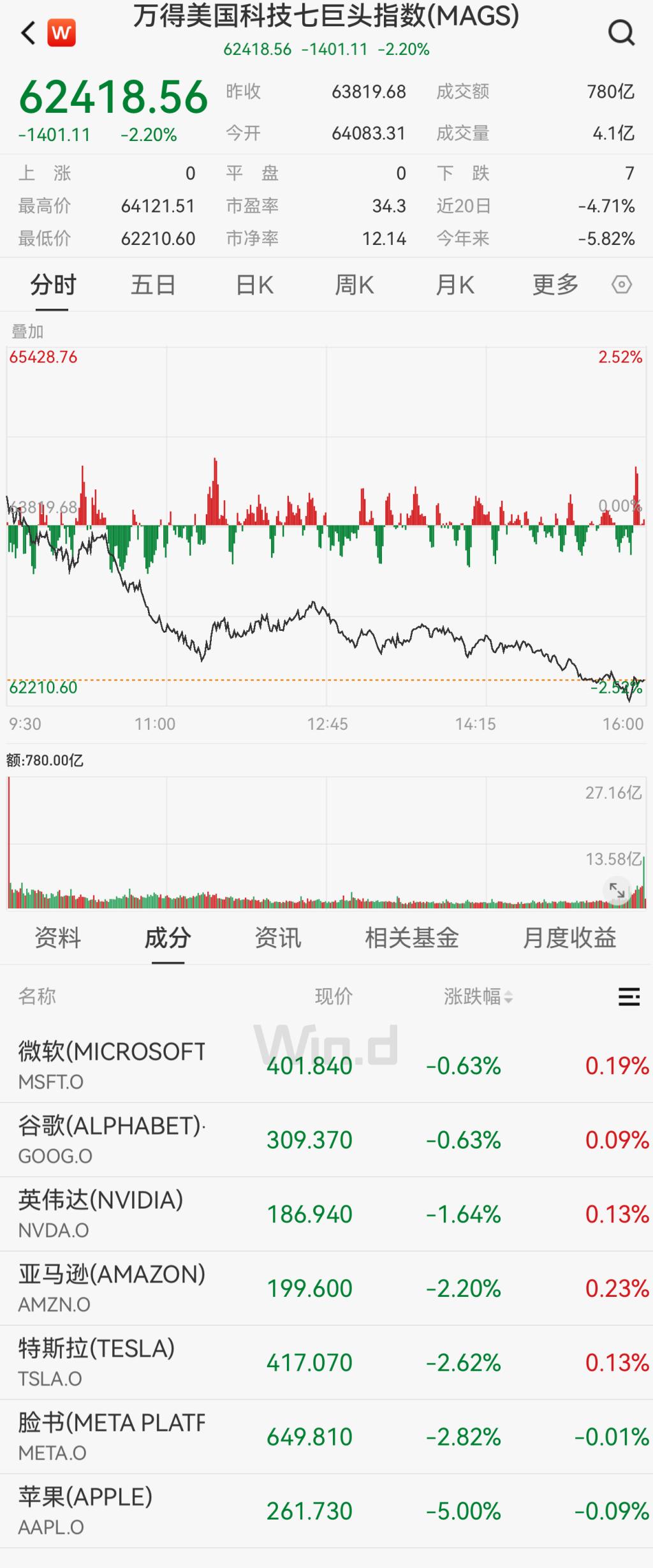 科技股普遍下跌挫伤人气,万得美国科技七巨头指数下跌2.20%。其中苹果下跌5%,脸书、特斯拉、亚马逊跌超2%,英伟达跌逾1%,谷歌跌0.63%,微软跌0.63%。