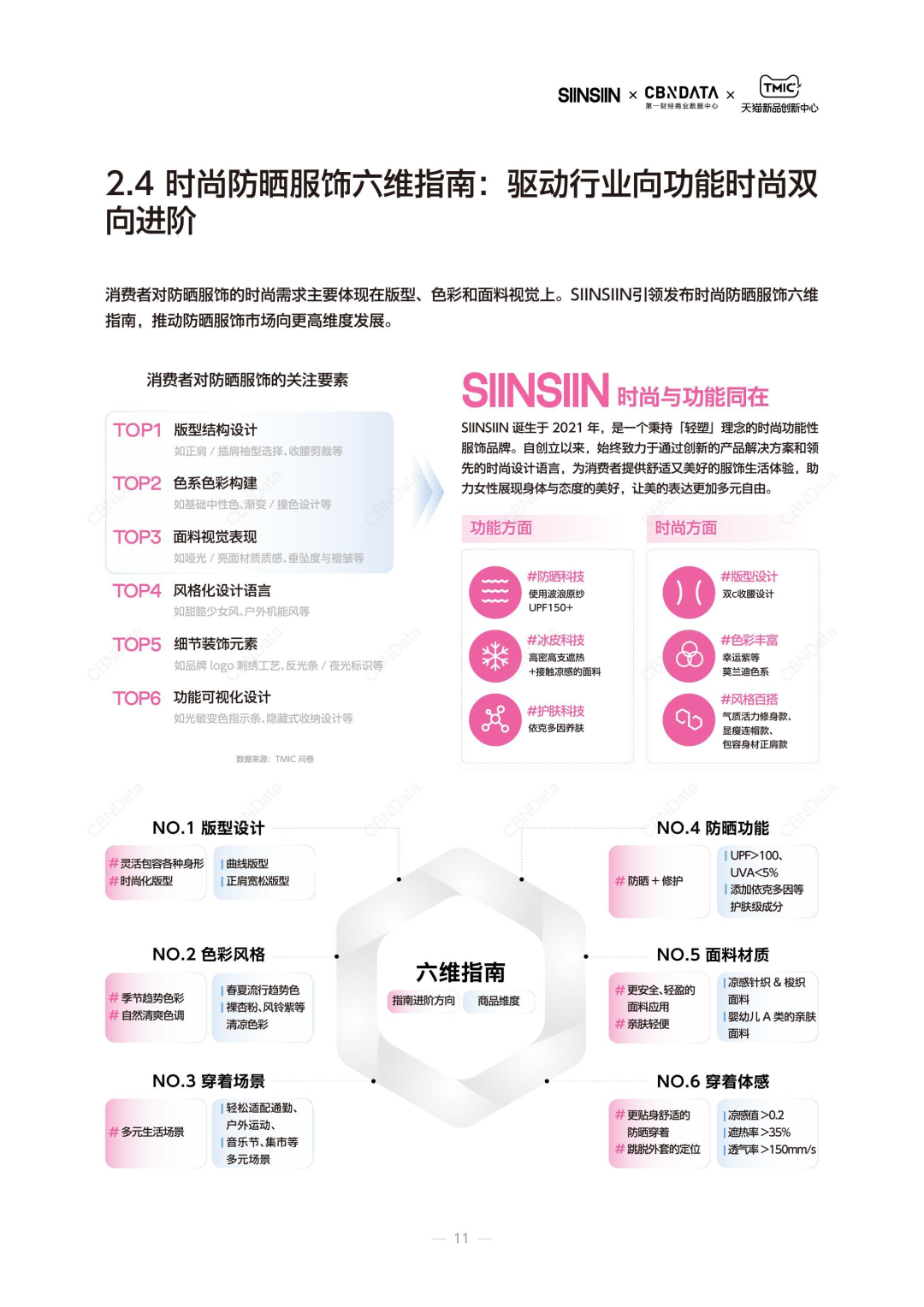 在《2025春夏时尚防晒服饰趋势指南》中,CBNData联合SIINSIIN、天猫新品创新中心推出包括版型设计、色彩风格、穿着场景、防晒功能、面料材质和穿着体感时尚防晒服饰六维指南,驱动行业向功能时尚进阶。
