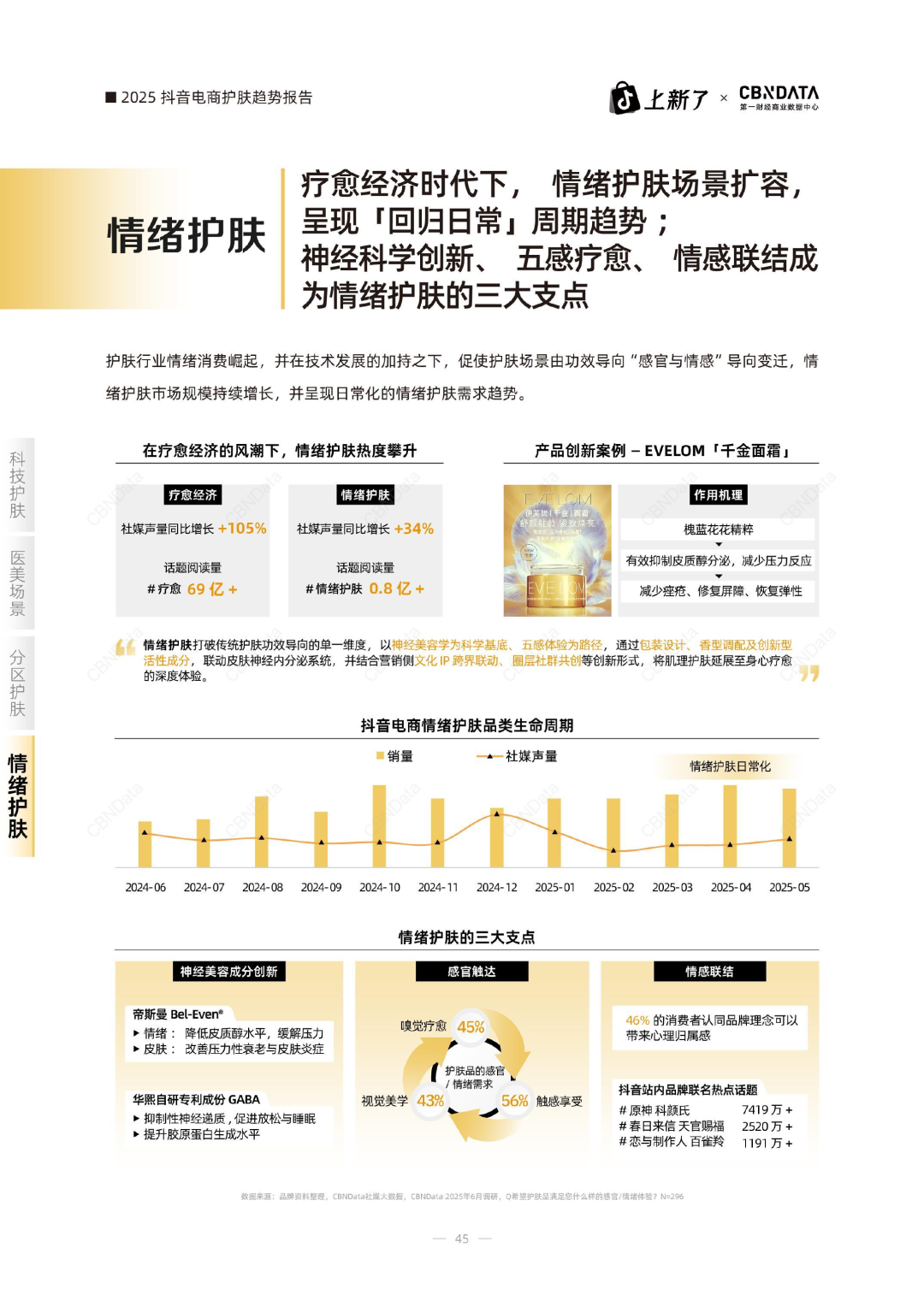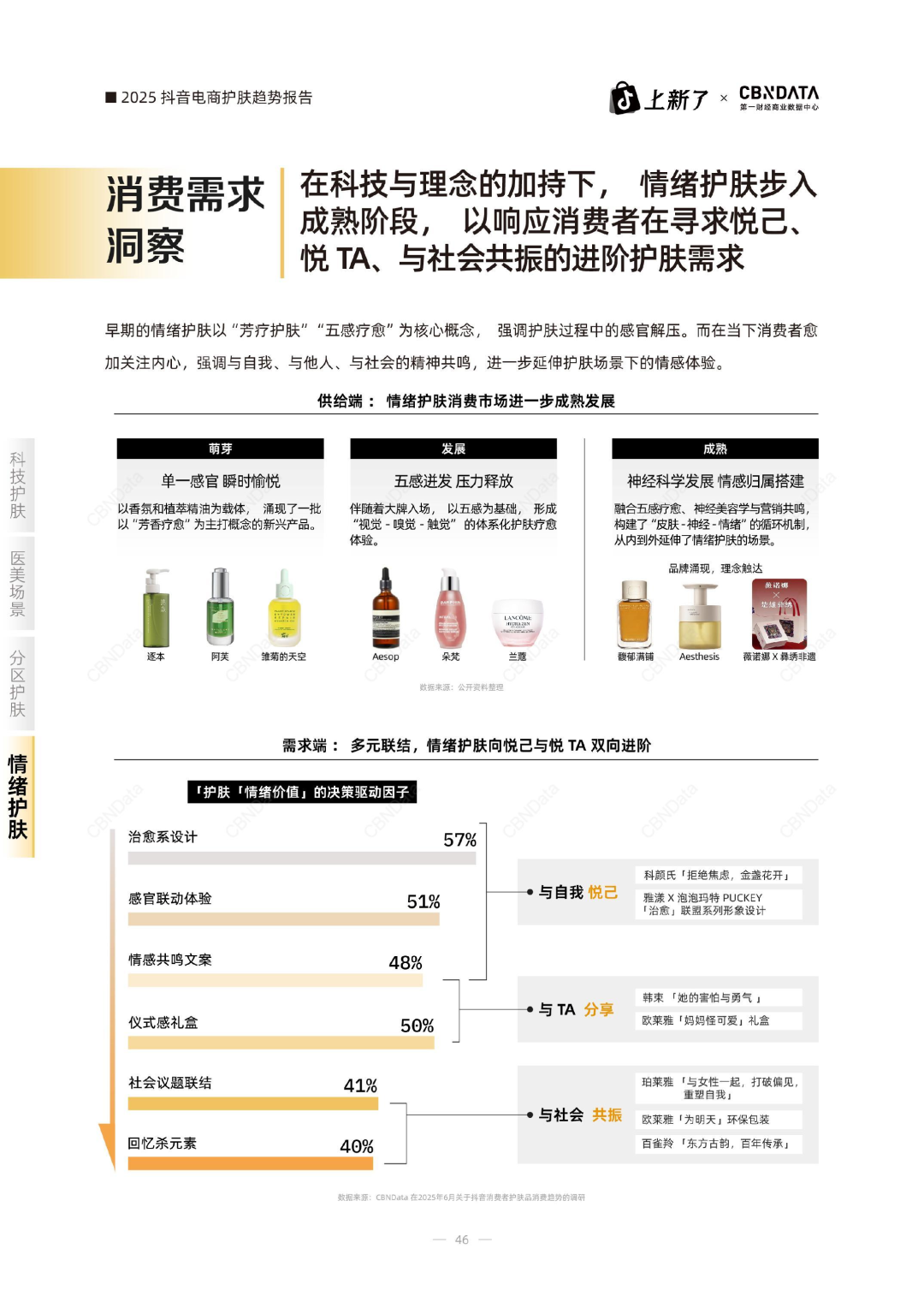 当科技点亮美丽,自我认同从模糊探索走向精准塑造。这一趋势下,美妆个护愈发承载“悦己”诉求。根据《2025抖音电商护肤趋势白皮书》,情绪护肤已步入成熟阶段并向着悦己与悦TA并行演进,其背后由神经科学、五感疗愈与情感联结三大支柱共同支撑。
