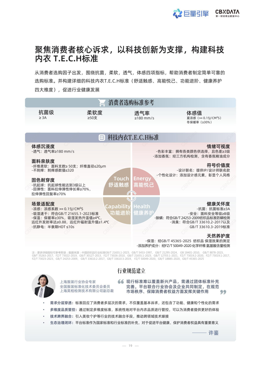 在《2025科技内衣趋势洞察白皮书》中,CBNData构建出以舒适触感、健康养护、功能进阶和高能悦己为维度的科技内衣T.E.C.H标准,旨在从平台、商家和消费者层面对行业发展给予助力。