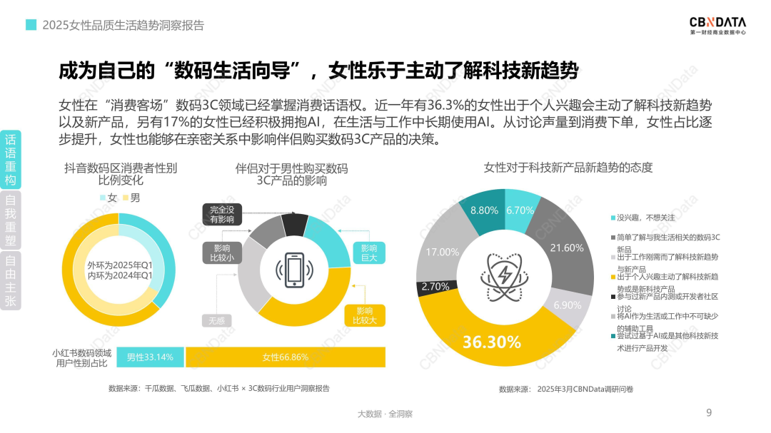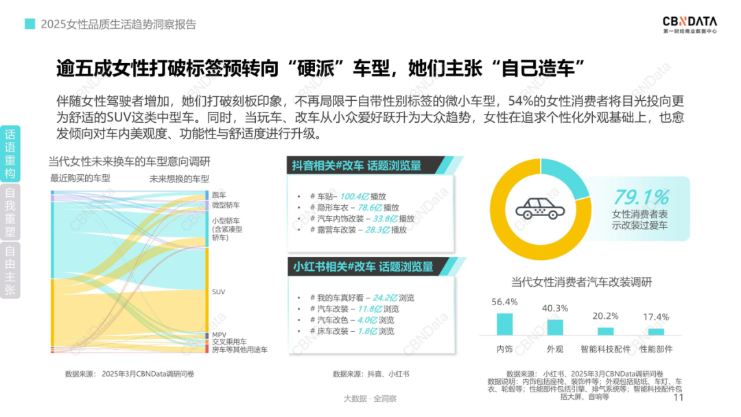 值得一提的是,女性的自我表达意愿在2025年尤为强烈。她们以消费者、决策者等多重主体性身份重构着商业底层逻辑。CBNData看到,曾经由男性主导的数码3C、汽车等领域正成为女性主场。消费动机也从“悦TA”转向“悦己”,最直接的体现便是女性穿衣哲学的核心转变为与身体和解的“体适哲学”。