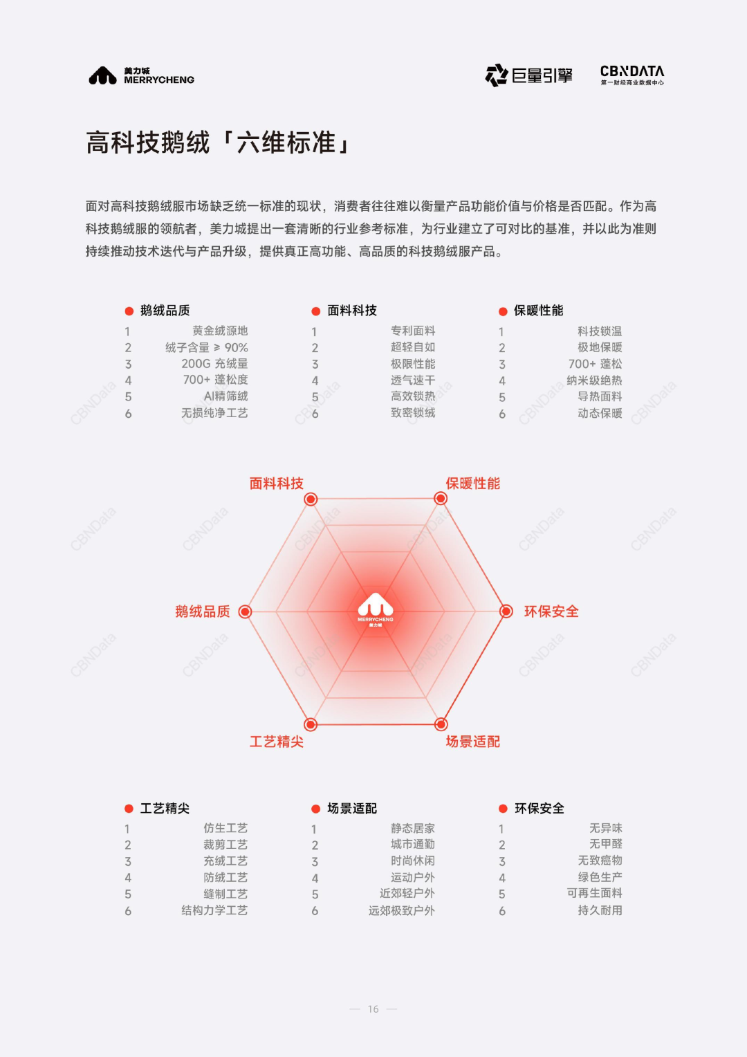 在《2025高科技鹅绒行业标准白皮书》中,CBNData联合美力城推出了高科技鹅绒“六维标准”,从鹅绒品质、面料科技、保暖性能、工艺精尖、场景适配、环保安全六大维度,明确高科技鹅绒服的核心评价体系。