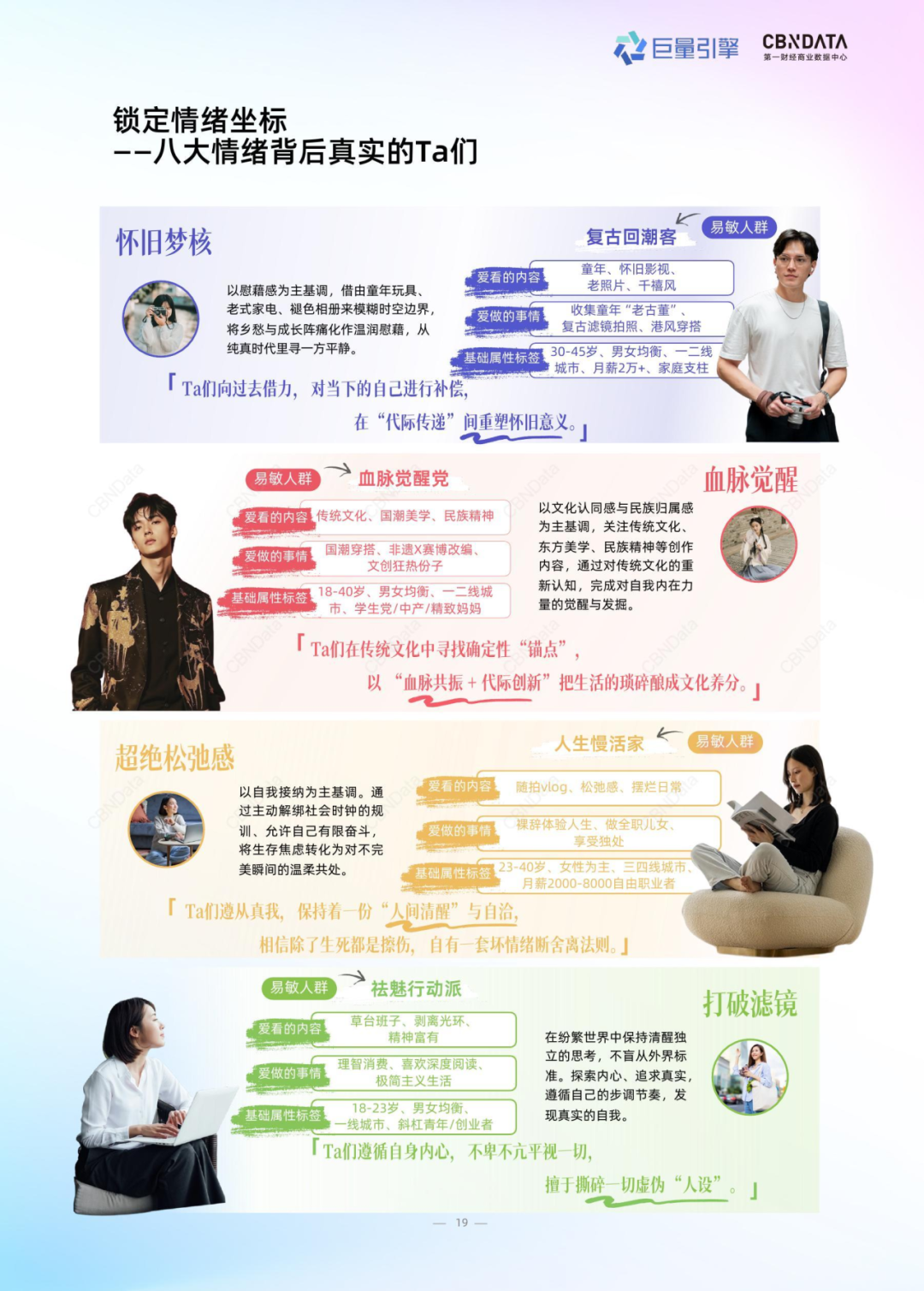 为了帮助品牌更好地“经营用户”,CBNData通过海量社媒内容采集,描摹出唤醒自愈、重塑内核、多巴胺爽感、一触即疯、怀旧梦核、血脉觉醒、超绝松弛感和打破滤镜八种典型的情绪心理及其易敏人群,并提出覆盖捕捉情绪、转化情绪、度量情绪的完整情绪营销策略,让情绪营销有迹可循。