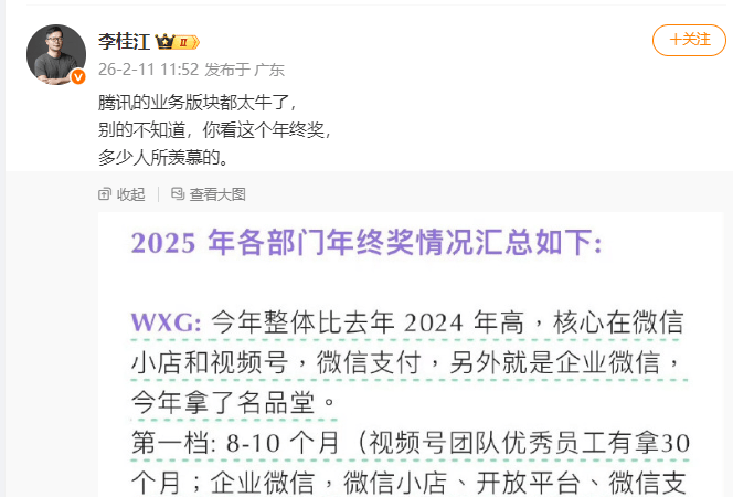 部分业内人士晒出的消息更刺激,比如逐鹿网创始人以及知名大V李桂江都在个人微博上转发了“2025年腾讯各部门年终奖”的截图,其中显示腾讯视频号团队优秀员工最高可拿到30个月工资奖励,而游戏业务条线的年终奖第一档在12个月工资左右。