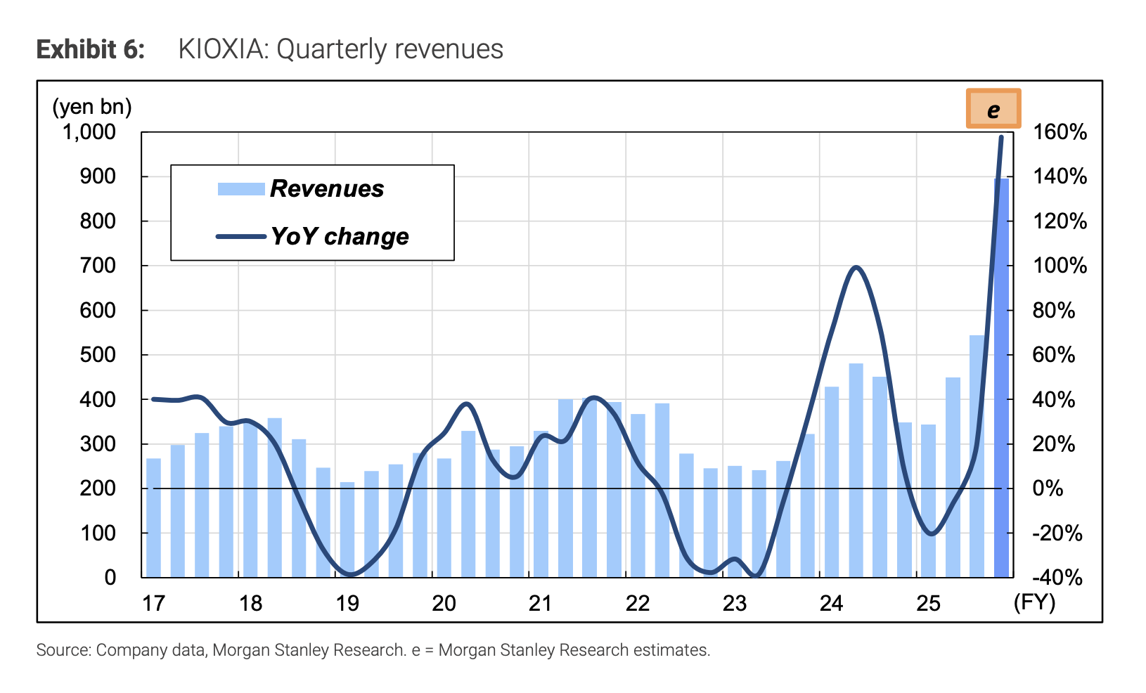 摩根士丹利的数据更为激进。该行将铠侠2026日历年ASP涨幅预期从同比增长75%大幅上调至超过100%,并预计一季度ASP将环比飙升近90%,随后二季度再环比增长10%。这一指引远超市场此前预期的3000亿日元营业利润水平,意味着公司与主要OEM客户的价格谈判取得了突破性进展。