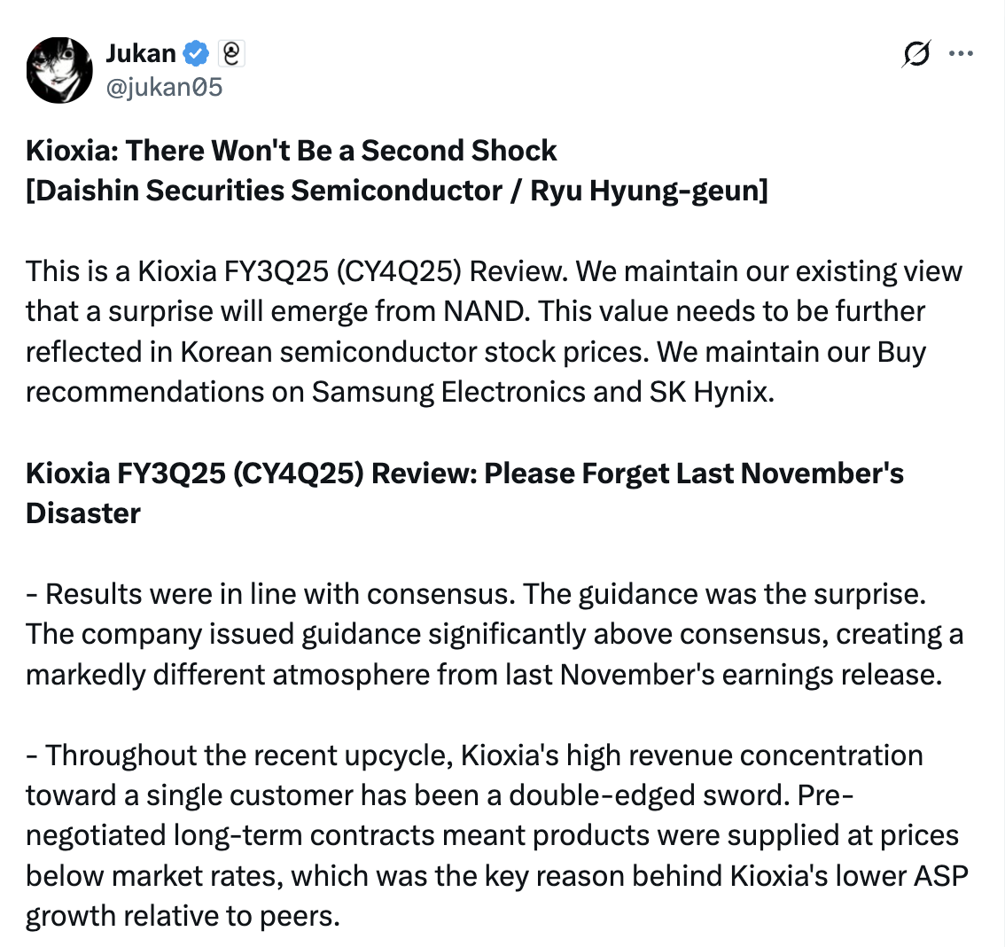 Daishin Securities最新指出,铠侠从2026年第一季度开始执行修订后的定价政策,预计北美主要客户的平均销售价格(ASP)将环比飙升约50%。这标志着铠侠终于打破了此前因长期合同约束而被迫以低于市场水平供货的局面,也意味着移动NAND ASP正在恢复正常水平。