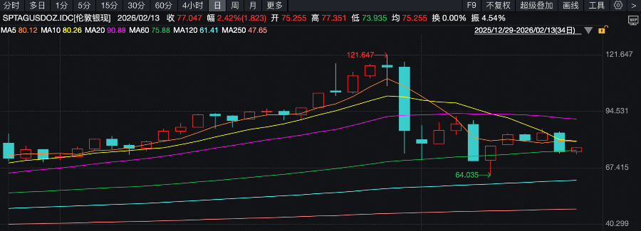 但市场脆弱心态并未消散,2月12日,白银再度重挫10.73%,收盘报75.22美元/盎司,基本抹去前几个交易日的涨幅。