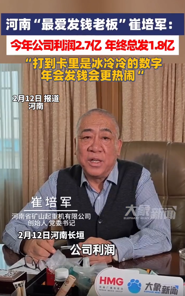 就在2月13日,这个“最爱发钱的老板”又来了。位于河南长垣的河南矿山集团厂区,800桌宴席,7000多人参与的年度盛会拉开帷幕。今年年终奖继续加码,现场发6000多万元现金,加上线上部分,一共1.8亿元,2024年是1.7亿元。