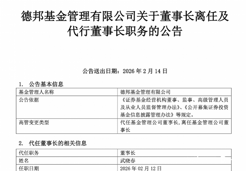 2月14日,德邦基金发布高管变更公告,经公司董事会审议通过,左畅因工作调整不再担任公司董事长职务,德邦证券总经理、财务总监武晓春代任该职,上任日期为2月12日。