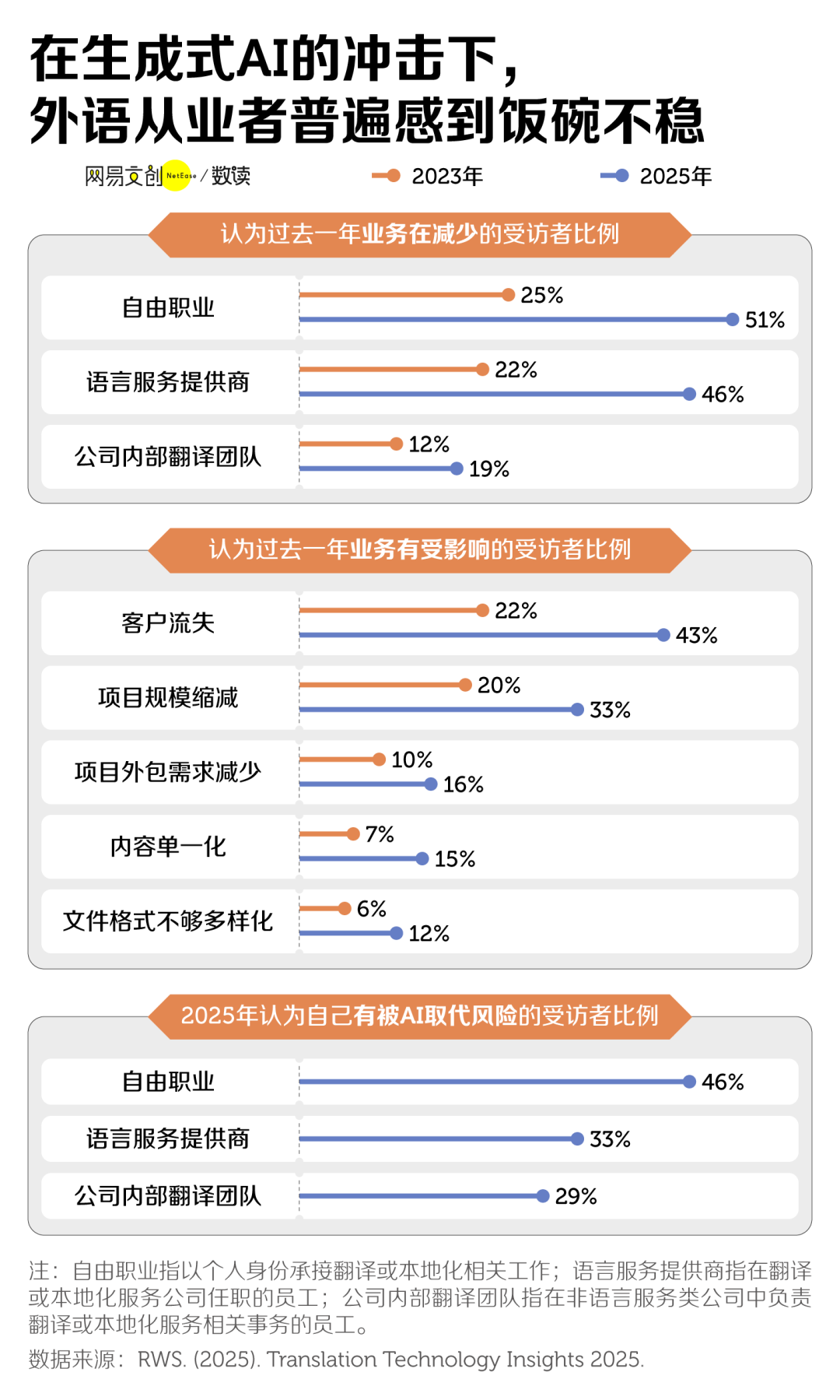 2025 年,一项针对全球近两千名进行翻译或本地化从业者的调查显示,生成式 AI 普及后,认为业务减少的受访者比例大幅上升。自由职业者的感受最为深刻,这一比例从两年前的 25% 飙升至 51% [9]。