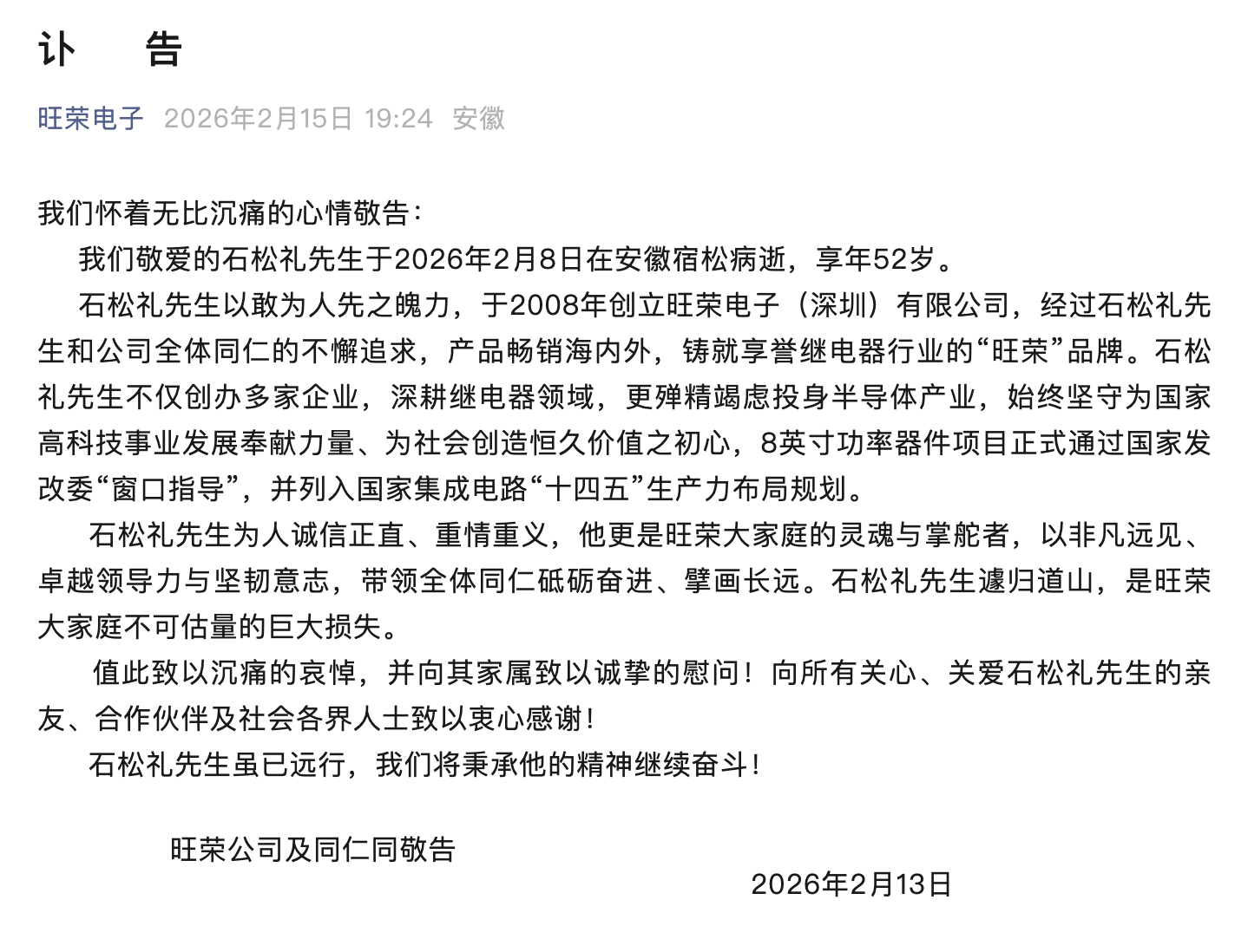 2月15日晚,旺荣电子发布讣告,石松礼于2026年2月8日在安徽宿松病逝,享年52岁。讣告称,石松礼于2008年创立旺荣电子(深圳)有限公司,不仅创办多家企业,深耕继电器领域,更投身半导体产业,是“旺荣大家庭的灵魂与掌舵者”。根据公司此前新闻稿,2025年8月28日,旺荣电子(深圳)有限公司成立17周年之际,石松礼以旺荣(WRG)品牌创始人、董事长的身份出席当日活动,并分享创业心得。