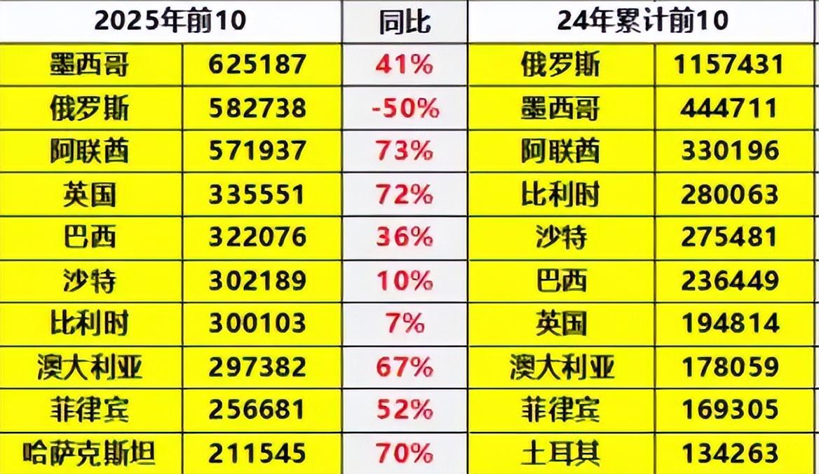 俄乌开战以后,欧美车企陆续撤出俄罗斯市场,中国汽车成功补位,2024年出口量高达115万辆,占据了俄罗斯市场近六成的份额,在俄罗斯的汽车销量排行榜上,前10个品牌里有9个都是中国品牌。