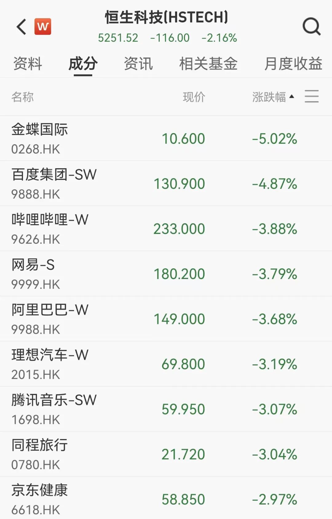 港股科网股多数飘绿,金蝶国际跌超5%,百度集团-SW跌近5%,哔哩哔哩-W跌近4%。
