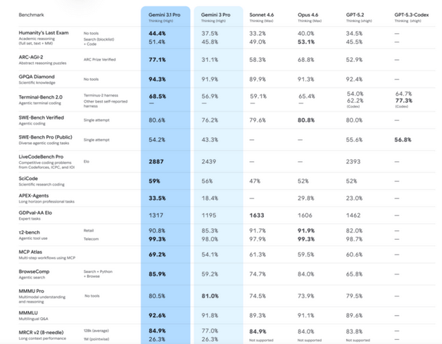 谷歌Gemini 3.1 Pro这次在ARC抽象推理和BrowseComp搜索任务上显著拉开差距,显示出明显的Agent倾向,而非单纯知识模型。