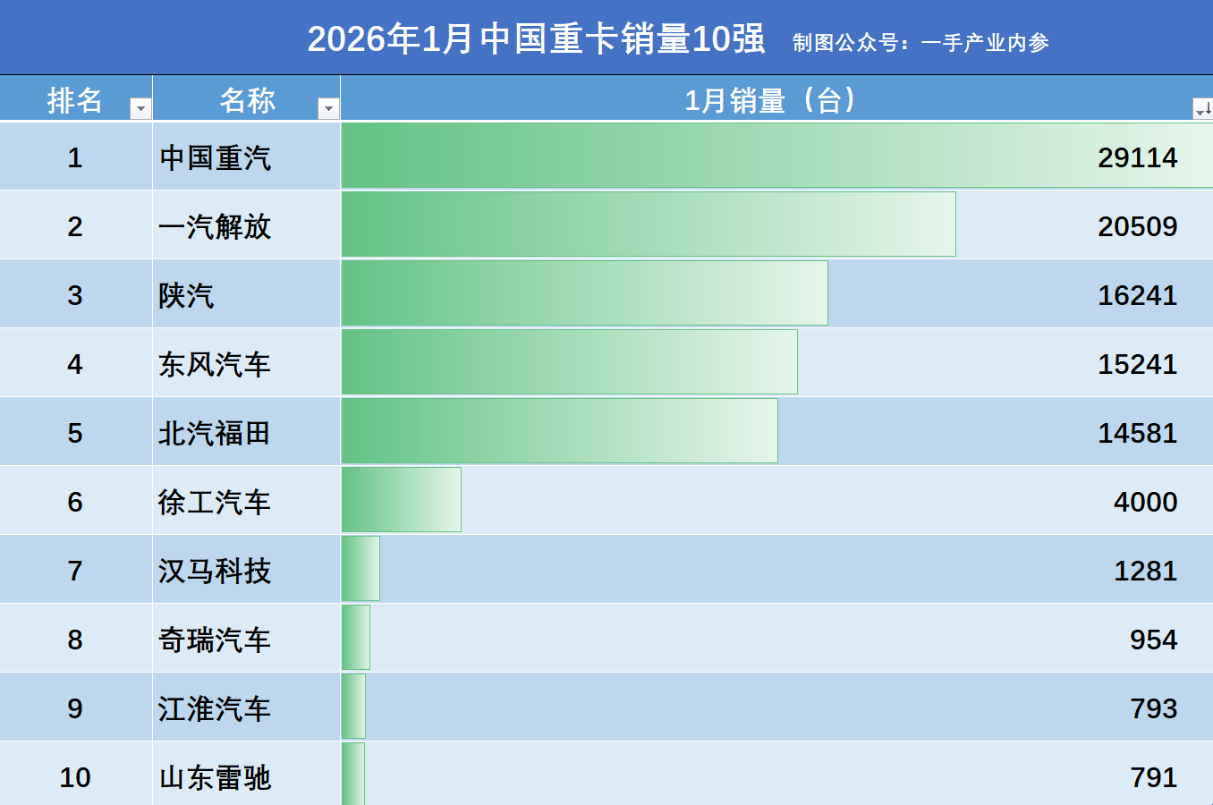 另附:2026年1月中国重卡销量10强厂商,数据源于:中国卡车信息网。