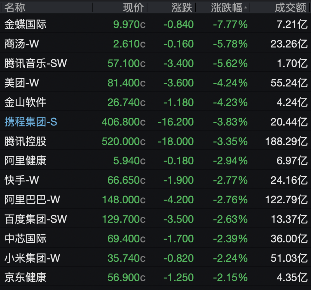 科网股普跌,商汤、腾讯音乐跌超5%,美团、金山软件跌超4%,携程集团、腾讯控股跌超3%,快手、阿里巴巴、百度、中芯国际、小米集团、京东健康均跌超2%。