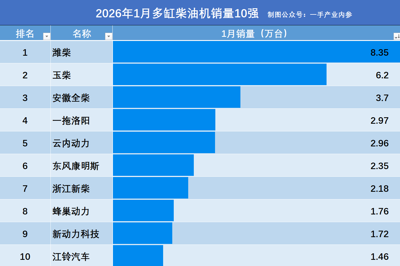 今天我们就为大家分享一下,2026年1月国内多缸柴油机销量的10强厂商,都是谁?